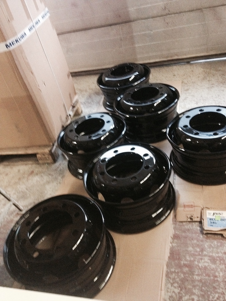 Die Felgen sind schon mal da! Der Umbau auf Einzelbereifung war eigentlich mit den Michelin XZL 255/100R16 geplant. Wir wollten einen Geländereifen haben, der eine gute Traktion bietet. Der XZL hat aber nur eine Lastindex von 126k mit der Zusatzkennung 134J, was bedeutet, dass er max. 3.400kg je Achse bzw. bei einer Geschwindigkeitsbeschränkung auf 100km/h 4.200kg tragen kann. (Nachtrag 01-2016: Mittlerweile haben wir rausgefunden, dass die Reifen in Verbindung mit den Woelcke-Felgen einen Schlauch benötigen) Der Fuso hat