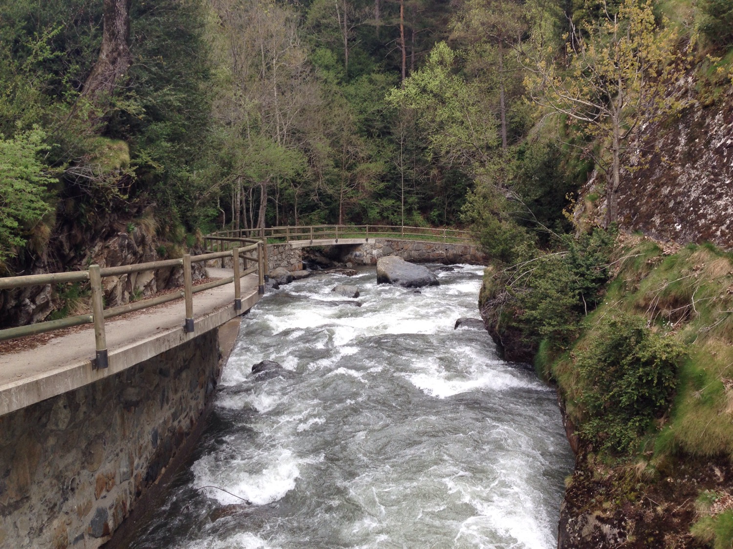 Dann ist uns der Trubel zu viel und wir folgen unserem Motto: immer rauf auf den Berg! Wir ignorieren einen Privatweg, der Durchfahrt und Betreten verbietet, und landen zufälligerweise an einem Bewässerungskanal mit Wanderweg. Genau da fahren wir lang. Der Weg ist ziemlich schmal, so dass wir für die vielen Fußgänger immer wieder anhalten müssen, aber die Sicht auf Andorra la Vella und Umland ist genial. Wir folgen dem Bewässerungskanal in beide Richtungen mit dem Fahrrad. In der einen Richtung können wir irgendwann nicht mehr weiterfahren, da der Wanderweg über große Felsen führt, also fahren wir zurück bis es nicht mehr weitergeht. Von dort aus folgen wir einfach einem anderen Weg, der wundervoll am Fluss entlangführt und an einer alten Kirche vorbei, wo gerade Kletterer den Fels bezwingen. Dem Weg folgen wir solange, bis er endet.