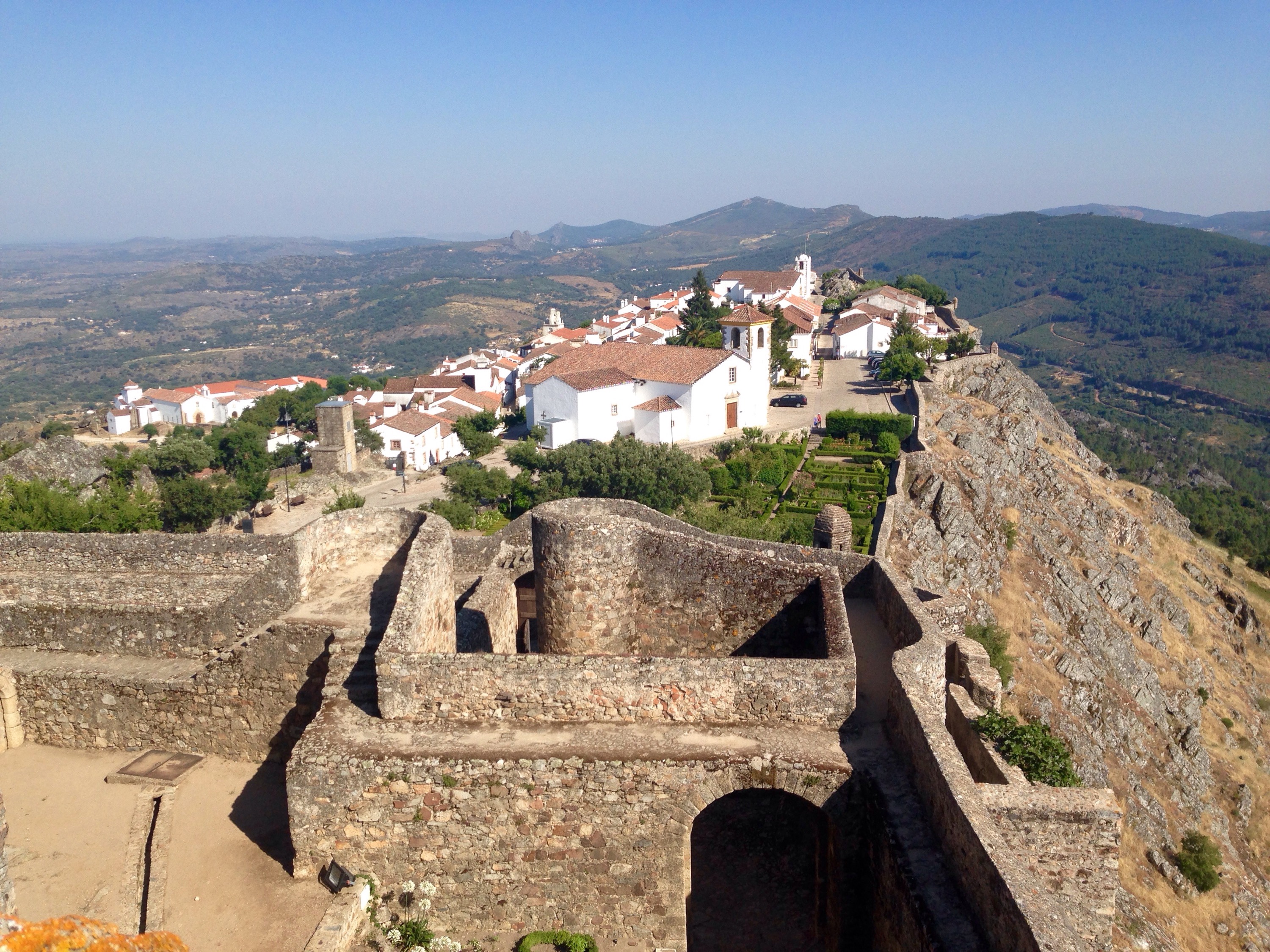 Der kleine Ort Marvāo ist ein hübsches Burgstädtchen aus dem 13. Jahrhundert und befindet sich auf einem Berg in einer von ca. 850 m in der Provinz Alentejo. Wir parken am Fuß des Berges in Portagem an einem Fluss, am Rio Sever. Hier hat man ein hübsches kleines Freibad gebaut, das einen kleinen Teil des Flusses einnimmt. Es ist kostenlos! Mit den Rädern fahren wir bergauf, um uns Marvāo anzusehen. Schweißtreibend! Es ist heiß und wir nutzen jede Gelegenheit, unsere Shirts mit kaltem Wasser aus den Brunnen nass zu machen. Wir müssen einen gewundenen Weg durch die Burgmauer fahren, um in den Ort zu gelangen. Der historische Ortskern steht unter Denkmalschutz.