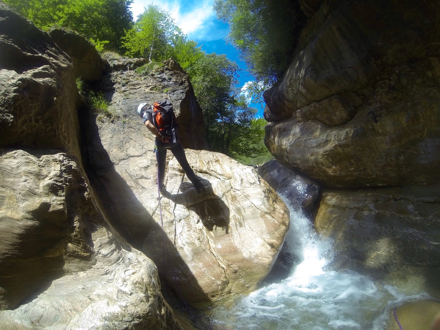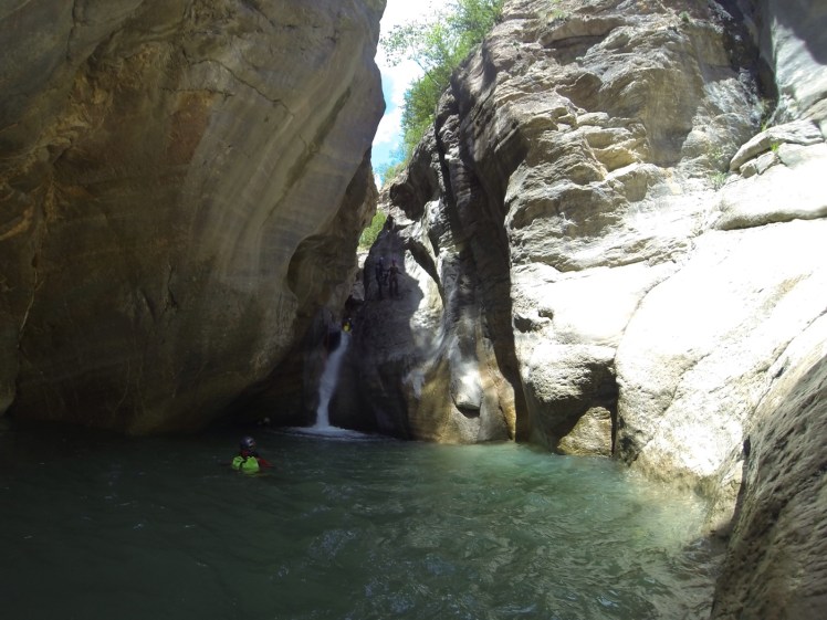 Das lange Warten ist ein großer Nachteil, wenn sich auch andere Gruppen im Canyon befinden. Der Vorteil aber ist, dass man „abgucken“ kann. Sei es beim Equipment, bei der Seiltechnik, sei es betreffend des Canyonings selber, denn ohne die Strecke zu kennen würde man niemals in irgendwelche Bassins springen, sondern ordentlich abseilen! Sind jedoch Guides vor Ort, verraten sie gerne, wo man springen kann. Letztlich ist es ein wahrer Glücksfall, dass wir ausgerechnet bei der ersten Tour so viele Gruppen mit erfahrenen Guides um uns herum haben.