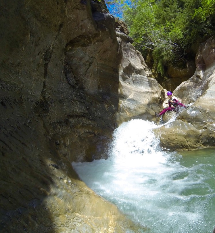 Wir sind wieder in den Pyrenäen, aber dieses Mal zum Canyoning. Wir haben das beide noch nie gemacht. Da es jedoch dem Klettern sehr ähnlich ist, kann’s ja so schwer nicht sein…, denken wir. In der Nähe von Biescas finden wir unsere erste Tour. Schwierigkeitsgrad II/III (von V), aber nur 300m lang. Am Abend zuvor haben wir uns bereits die Einstiegsstelle angesehen und starten nun mit unserem dynamischen Kletterseil, unseren 3mm-Surfneoprenanzügen (die Canyoninganzüge haben eine Dicke von 5mm oder mehr), Klettergurten, Kletterhelmen und Wanderstiefeln die erste Tour. Glattgeschliffene Rutschen und schöne Wasserbecken sind hier im Barranco Gorgol besonders.