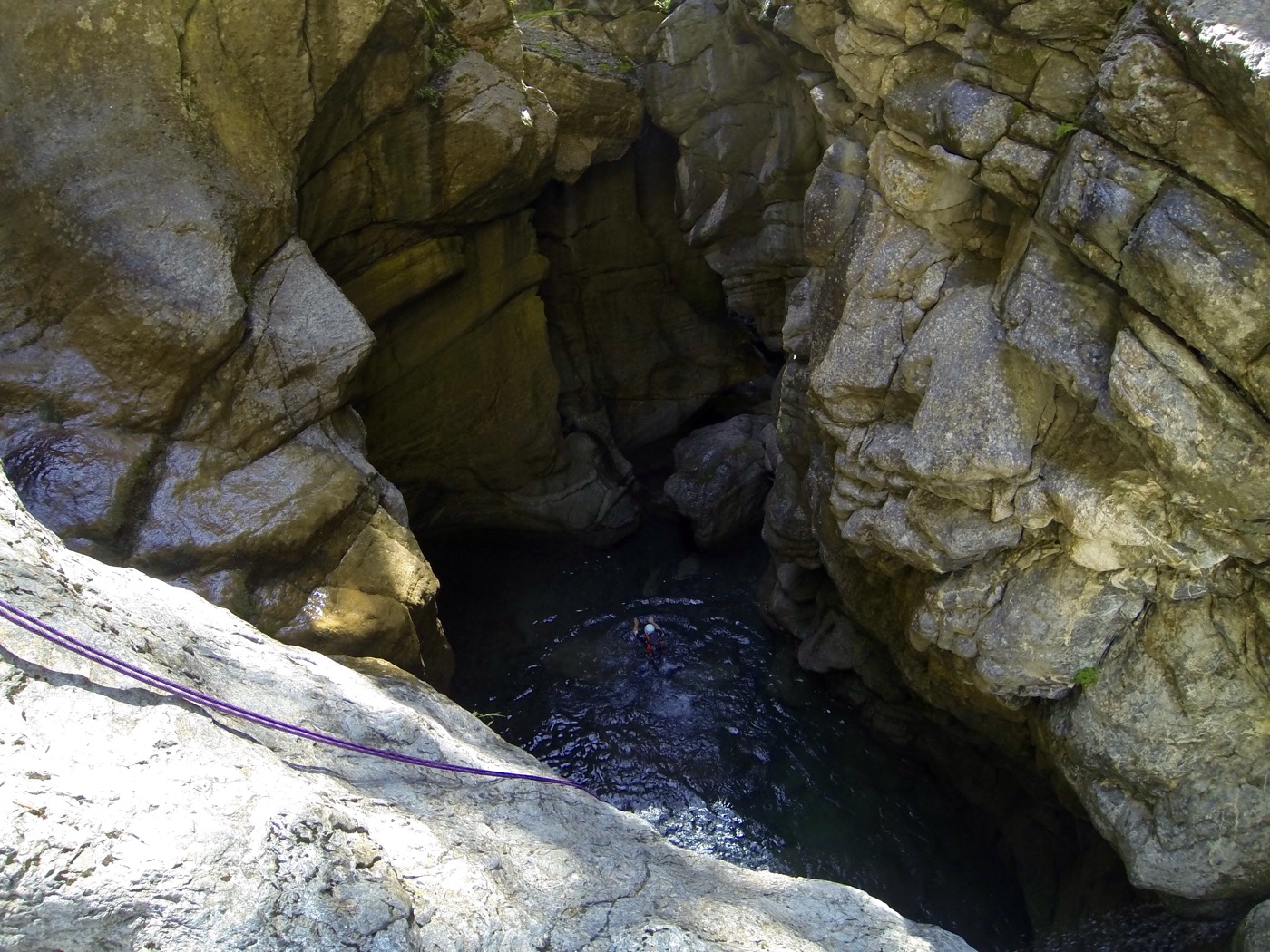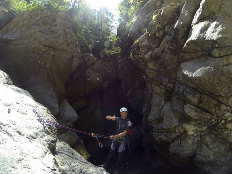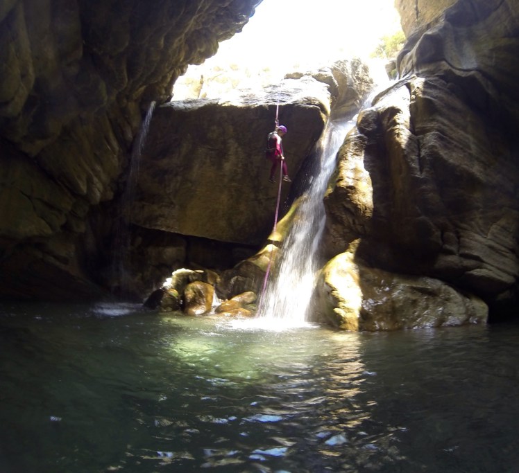 Teilweise sind Fixseile angelegt, die wir einfach nutzen können. Am einzigen Abseilpunkt im Canyon direkt neben einem Wasserfall (wirklich schön!) landen wir direkt im Wasser, und das ist richtig kalt.