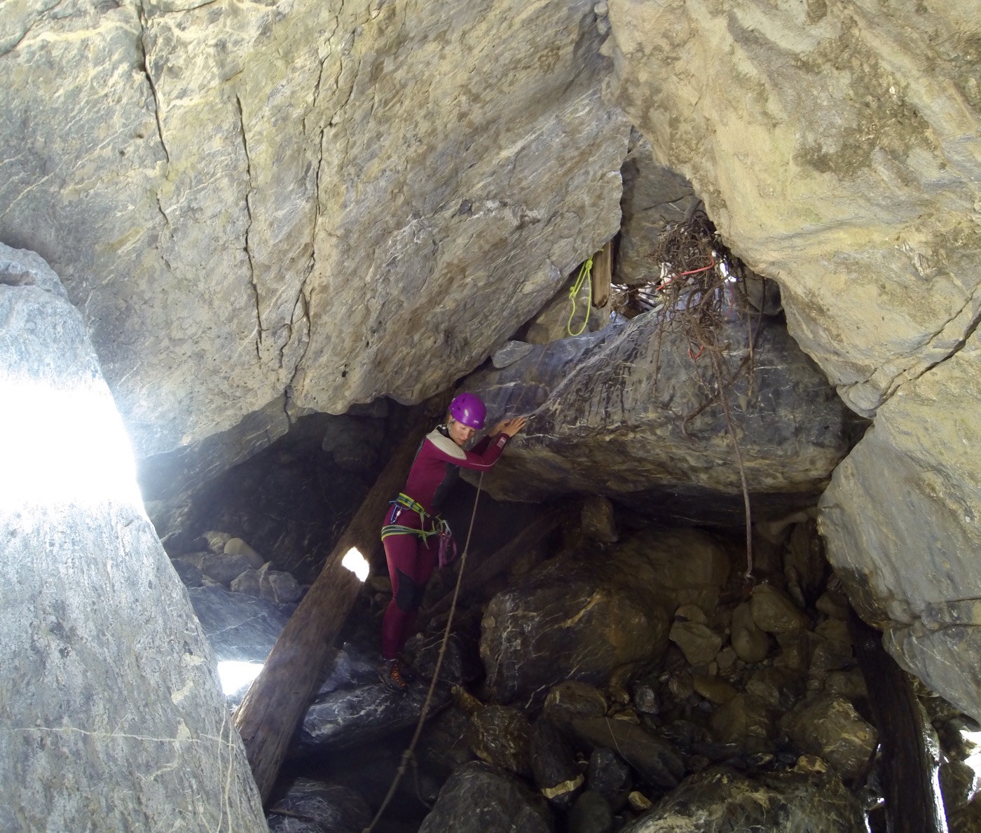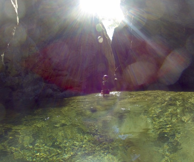 Nach der zweiten Abseilaktion stehen wir mitten Flussbett. Wasser ist hier spärlich vorhanden. Es rauscht, aber wir sehen nichts. Das Wasser fließt unter uns, unter den Steinen und Felsen durch. Wir ziehen alles an: Neoprenanzüge, Helme, Gurte… Nach wenigen Schritten sind wir bereits von hohen Felswänden umgeben. Die gesamte Schlucht laufen wir ohne weitere Besucher, wir müssen uns den Weg selber suchen. Das macht das Ganze so spannend: was kommt wohl hinter dem nächsten Felsblock, hinter der nächsten Windung? Hier müssen wir mehrmals großes Felschaos über- oder unterklettern.