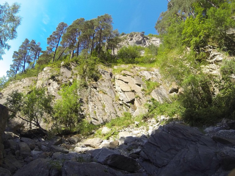 Wir entscheiden uns nicht für den klassischen Ausstieg zur den Tunnel umgehenden Straße, sondern folgen dem Fluss noch etwas, biegen dann rechts in einen anderen Fluss ein, dem wir aufwärts folgen (mal eine ganz andere Richtung fürs Canyoning), denn der bringt uns nach insgesamt 1 1/2 Stunden direkt zum Parkplatz.