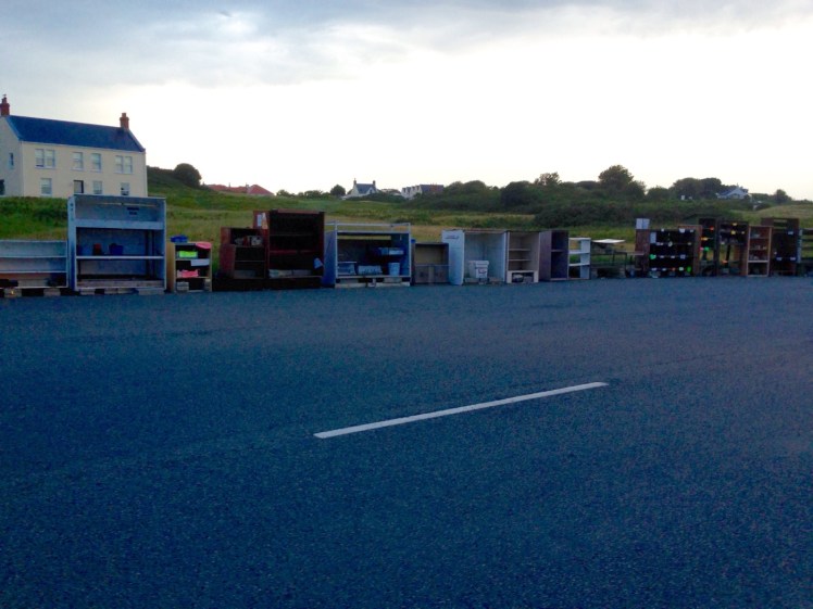 In unseren Augen ist Guernsey noch gepflegter und hübscher als Jersey; die Vorgärten sind alle akkurat geschnitten und die Wohnhäuser so schön, dass man sofort einziehen möchte. Anders als auf Jersey mag man hier aber extrem Mauern. Jedes Haus ist irgendwie eingemauert. Selbst auf den Landstraßen fahren wir Mauern entlang. Es gibt noch eine kleine Besonderheit auf Guernsey (und auch auf Jersey): sogenannte Hedge Vegs. Fährt man auf Guernseys Straßen wird man immer wieder auf zusammengenagelte Marktstände stoßen, die dem Verkauf von Obst, Gemüse und manchmal auch Blumen dienen. Obst und Gemüse liegen in den Boxen und der Käufer wirft einfach den ausgeschriebenen Preis in die dafür vorgesehene Box, Büchse oder auch Milchkanne, was eben gerade verfügbar ist.