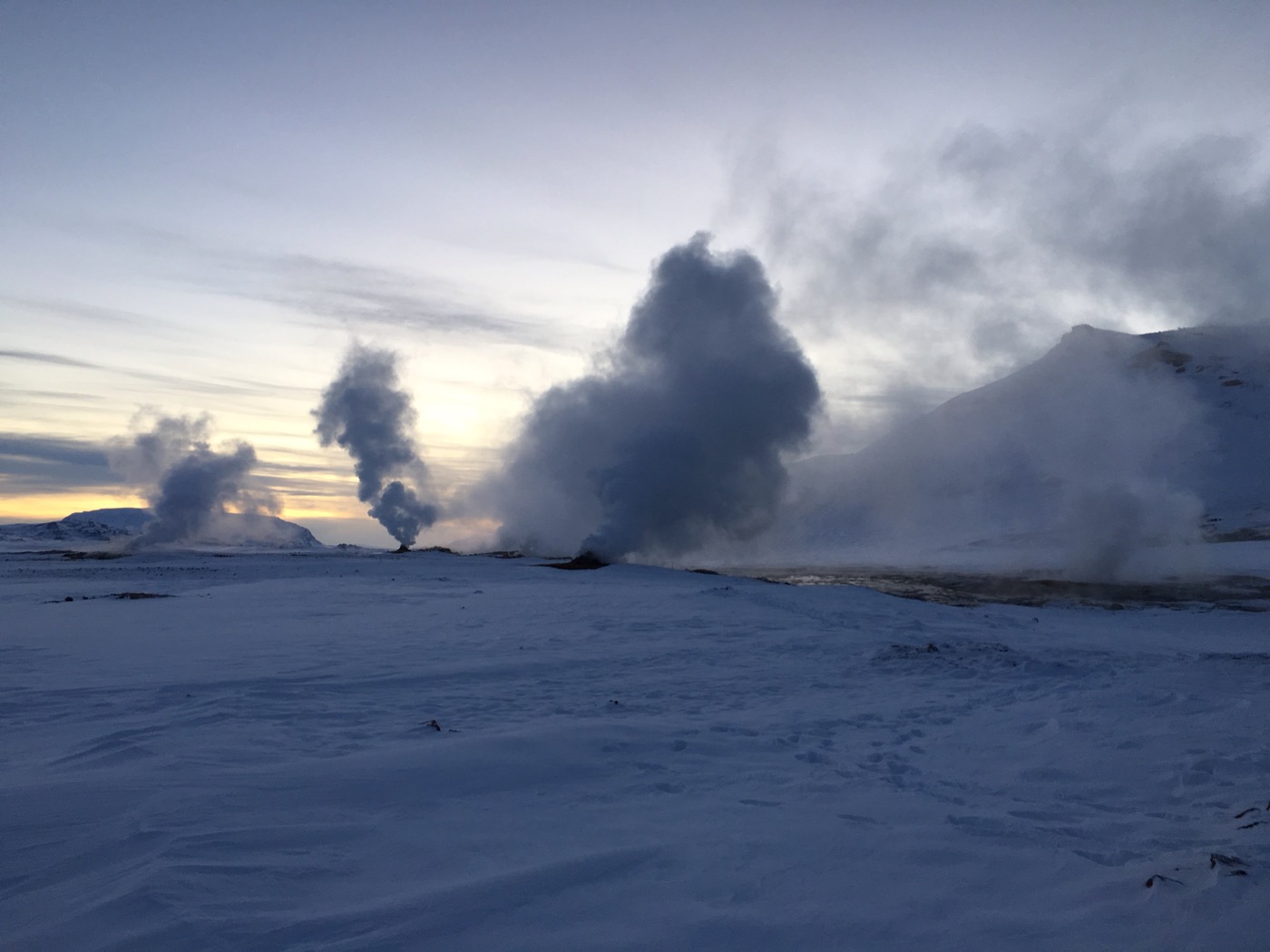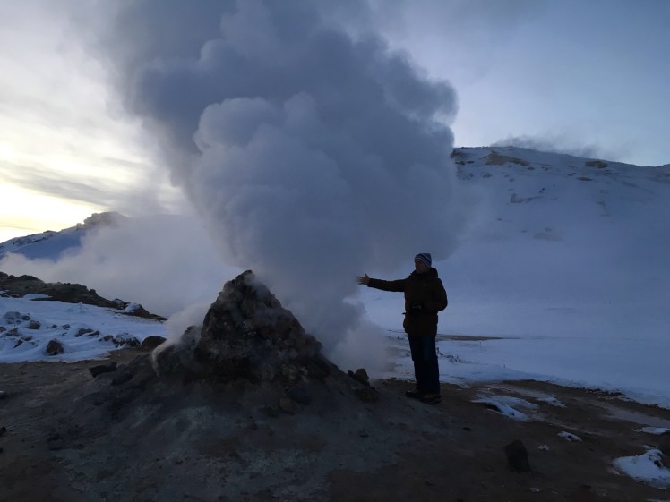 Wir fahren auf der vereisten Piste Richtung Mývatn, schauen uns Hverir, ein Hochtemperaturgebiet beim Pass Námaskarð, das so richtig schön nach faulenden Eiern stinkt, an