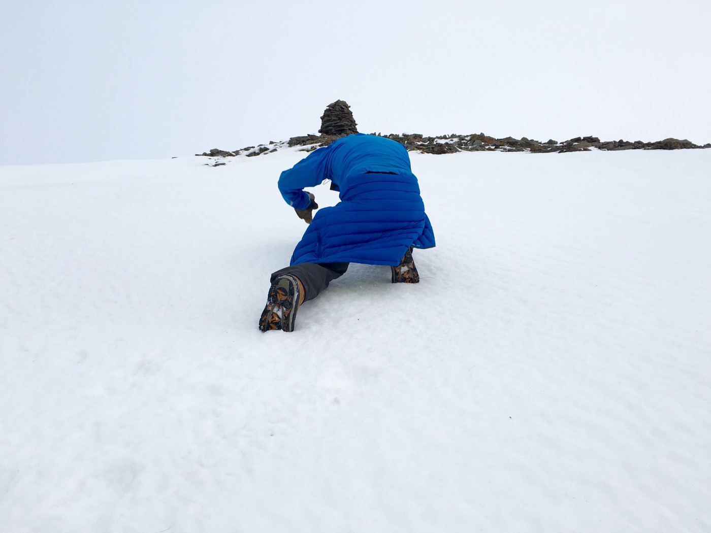 Da es verschneit ist, gibt es keinen Weg. Das letzte Stück vor der Bergkuppe ist so steil und vereist, dass Alex mit einem Stein Trittstufen schlagen muss, damit wir überhaupt hochkommen.