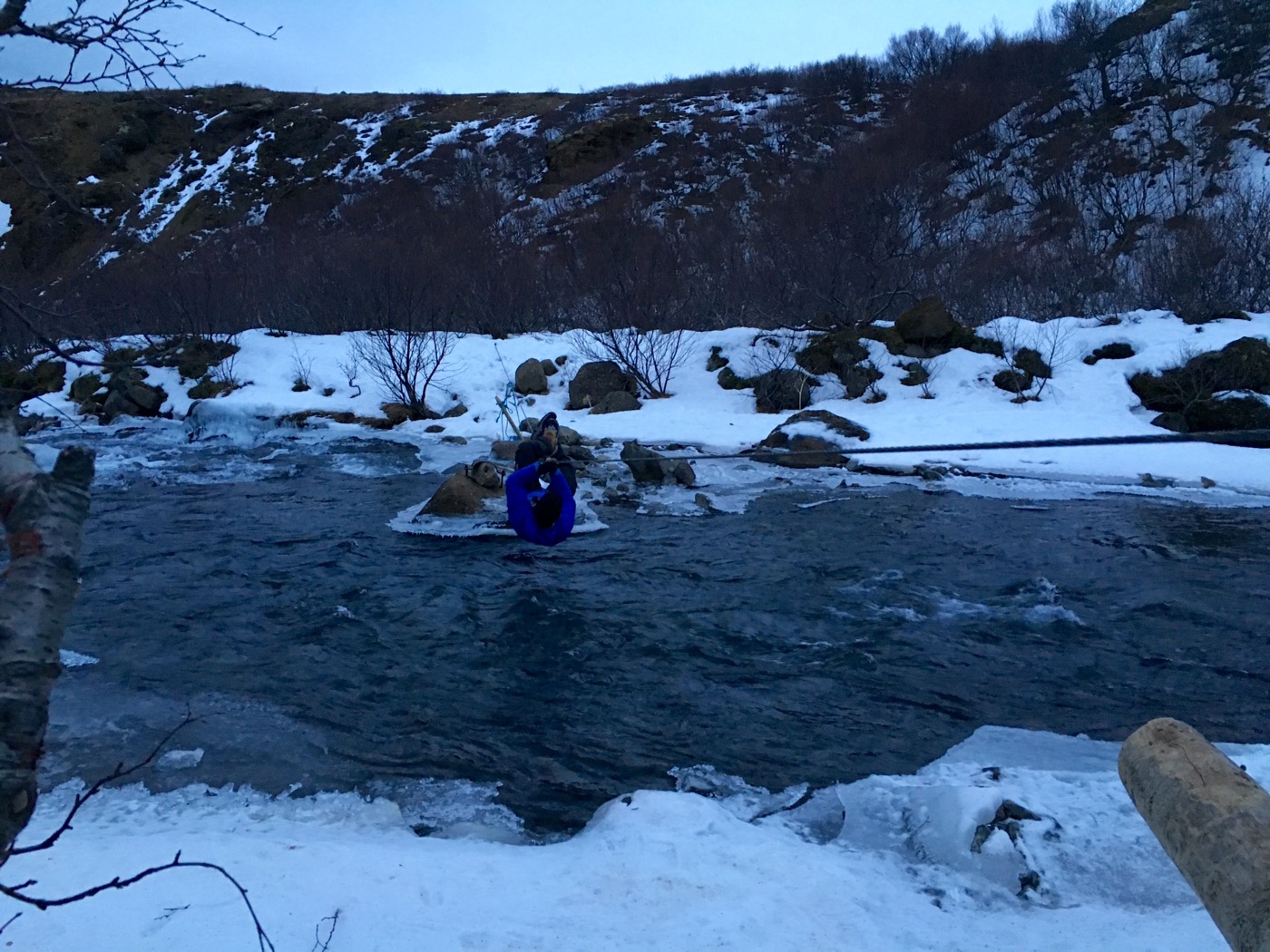 Unter anderem müssen wir einen Klettersteig entlang; einem total vereisten Klettersteig. Wegen der vorhandenen Seile zum Festhalten ist das Herumrutschen nur halb so schlimm. Die Sonne ist bereits am Horizont verschwunden als wir den Fluss erreichen. Ich bin zu allem entschlossen, aber glücklicherweise können wir die Schuhe anbehalten. Die Überquerung des Flusses wird buchstäblich zum Drahtseilakt: ein Drahtseil ist über den Fluss gespannt und irgendjemand hat notdürftig eine Art Sitz gebaut, aus einer Holzplatte mit einem Seil – der auf der anderen Seite liegt. Also hangeln wir uns einfach an Armen und Beinen über den Fluss. Dabei kommen wir dem Fluss so nahe, dass zumindest bei mir die Mütze nass wird.