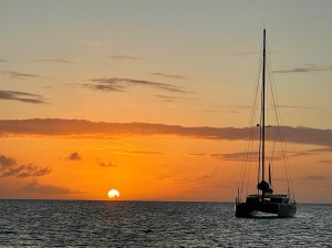 Denn leider dreht der Wind ganz verrückt von 48° auf 85° bis auf 120° (ganz falsch, weil wir plötzlich Richtung St. Kitts & Nevis segeln)… Erst gegen 4 Uhr in der Nacht dreht der Wind auf 22-23°. Zwischendrin schießt der Wind von 5 Knoten (wollen schon Segel einholen) auf mehr als 20 Knoten (wir reffen), flaut wieder komplett ab (müssen Segel komplett einholen), Wind legt wieder zu (wir hissen die Segel erneut), dann wieder eine Böe mit fast 30 Knoten (wir reffen schon wieder) und so weiter. Wir schlafen also überhaupt nicht, weil immer irgendetwas ist. Als ich während Alex’ Nachtwache daliege, denke ich so: „Nie wieder Am-Wind-Kurs!“ Angekommen am schönen Ziel vergisst man das aber ganz schnell wieder. 😄