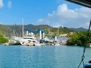Und so stehen wir typisch Deutsch, wie vereinbart, Punkt 7 Uhr vor dem Travellift. Aber erst einmal geht gar nichts, weil bereits ein Monohull in den Schlaufen hängt: seit dem Vortag versucht man, die Hubkiele einzuziehen, aber da klemmt was. Bis weit nach 8 Uhr ist man am Hämmern, Ziehen und Machen. Gegen 8 Uhr schwimmt bereits der nächste Kandidat für den Travellift im Hafenbecken herum. Als ich an Land mal nachfrage, wie lange das jetzt noch dauere und darauf hinweise, dass es gleich wohl noch voller werde, ist man extrem karibisch entspannt: es dauert eben so lange wie es dauert. Ich verständige mich mit dem französischen Monohull, dass wir vor ihm in die Travellift-Bucht fahren und kurz vor 9 Uhr ist es dann für uns so weit. Man schiebt uns direkt an den Zaun mit nettem Blick zur Straße und setzt uns später prompt einen kleinen Monohull direkt vor die Nase.